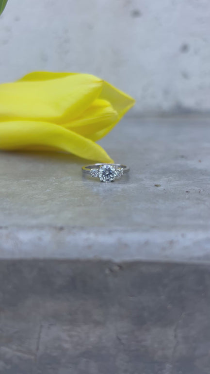 Three-stone diamond engagement ring set with round-cut lab diamonds.